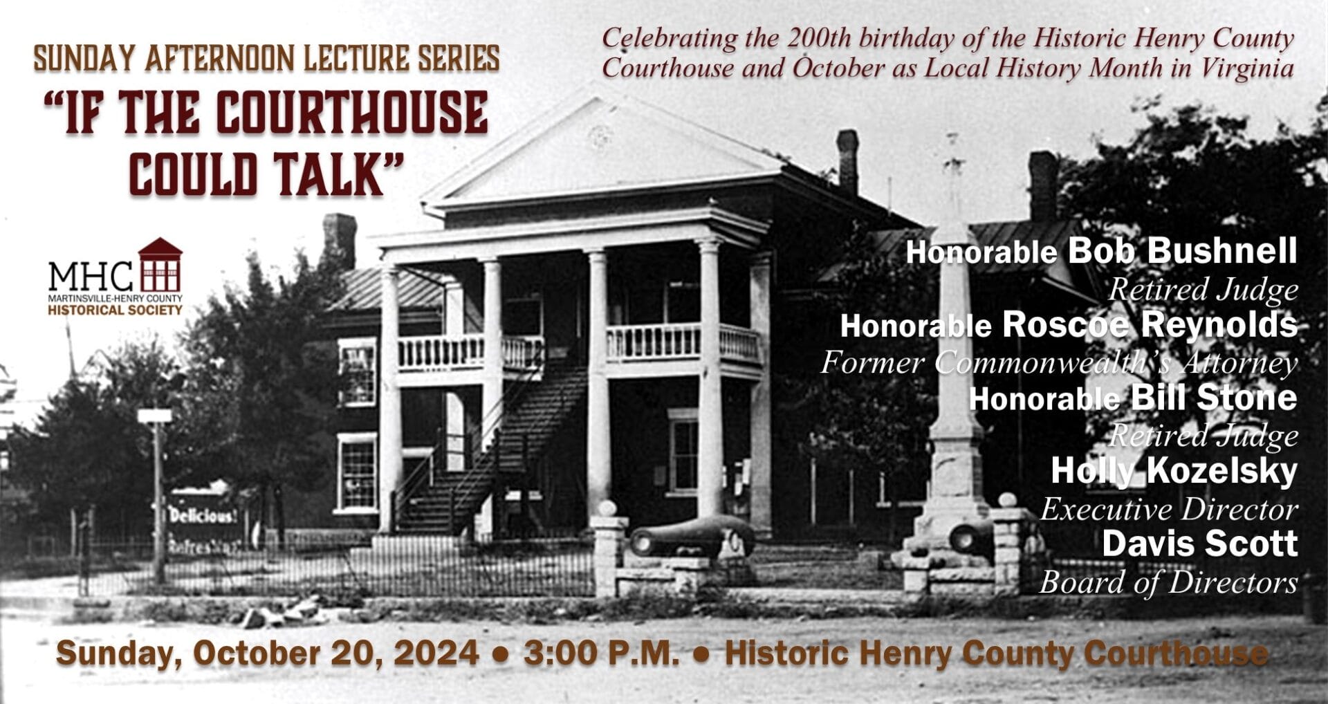Join the Martinsville-Henry County Historical Society for our monthly Sunday Afternoon Lecture, “If the Courthouse Could Talk,” on Sunday, October 20, 2024, 3:00 P.M., at the Historic Henry County Courthouse.