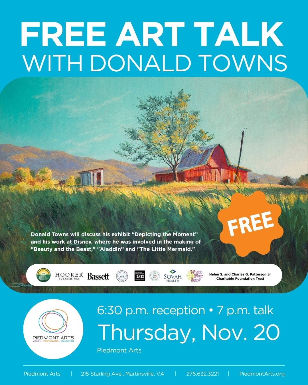 Free art talk this Thursday at Piedmont Arts! https://www.visitmartinsville.com/blog/free-art-talk-this-thursday-at-piedmont-arts/ Tue, 18 Nov 2025 16:15:29 +0000 https://www.visitmartinsville.com/?p=15593 Art Talk with Donald Towns 7 p.m., Thursday, Nov. 20, Piedmont Arts Donald Towns will discuss his exhibit, Depicting the Moment, and his work at Disney, where he was involved […]