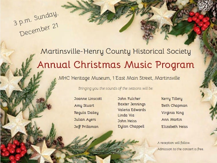 The post Christmas Music Program, Opening Reception, plus your first look at this year’s Historic Garden Week appeared first on Martinsville Tourism.