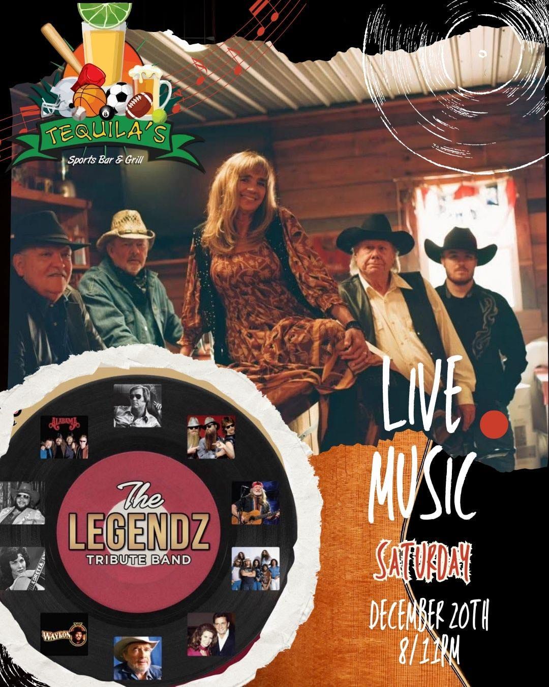 The Legendz Tribute Band will be performing songs you listened to yesterday that you love to hear today at Tequila's Sports Bar & Grill on Saturday December 20th, 2025! Show: 8:00pm