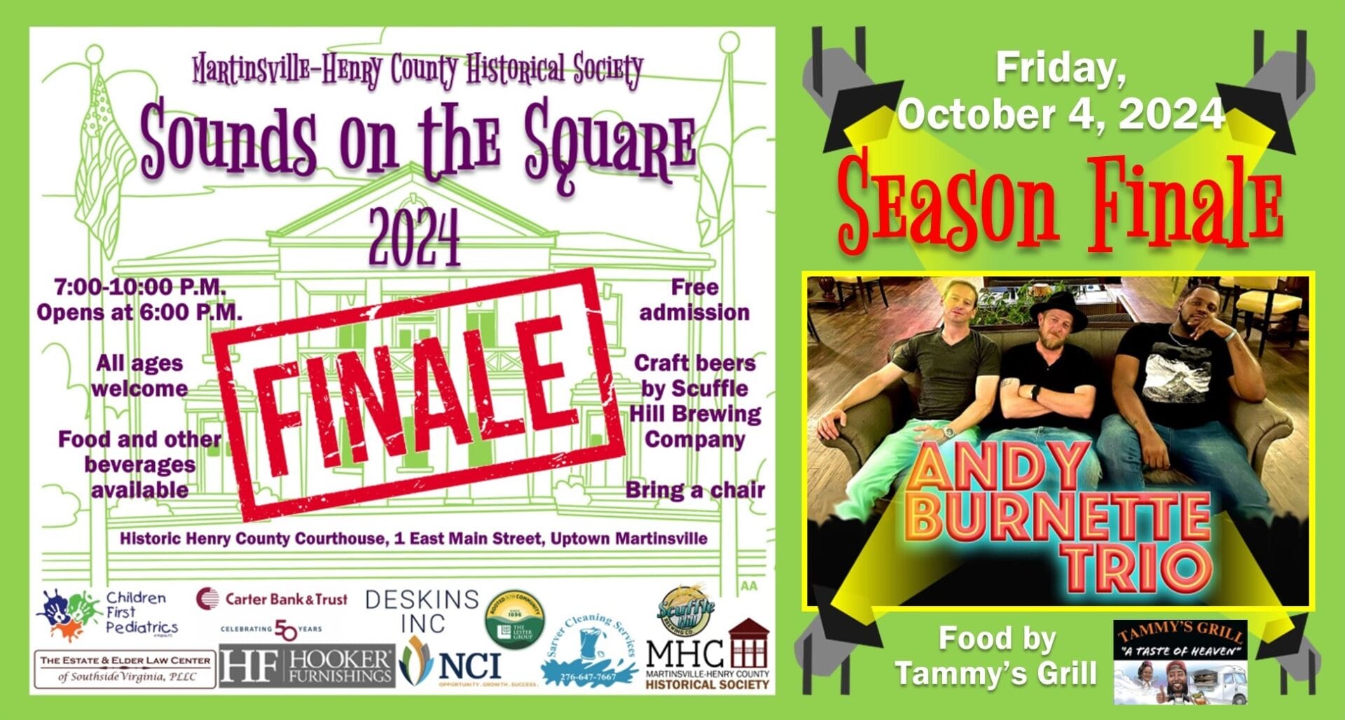 Join us for the Season Finale of Sounds on the Square 2024 with the Andy Burnette Trio on Friday, October 4, on the Plaza of the Historic Henry County Courthouse, 7:00-10:00 P.M.