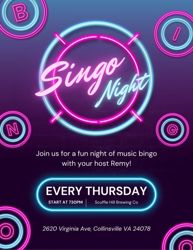Scuffle Hill Brewing Company hosts Singo, a fun, musical twist on the classic game of Bingo, every Thursday night. Instead of numbers, players listen for clips of popular songs. Each participant receives a free Singo card with song titles—when a song plays, players mark it on their card.