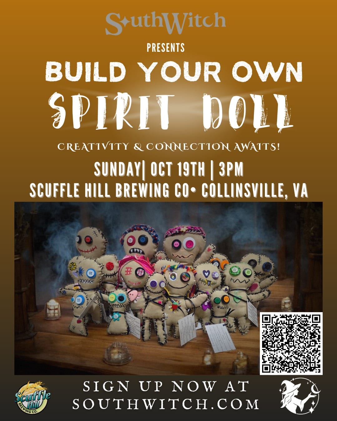 Build Your Own Spirit Doll Workshop at Scuffle Hill Brewing - Collinsville, VA Scuffle Hill Brewing - Collinsville, VA 2620 Virginia Ave Collinsville, VA 24078 Sunday, October 19th | Time: 3 pm Ticket Price: $40 Join us for a spooky and spirited night of doll-making magic! Your ticket includes: One pre-sewn medium-size Spirit […] |