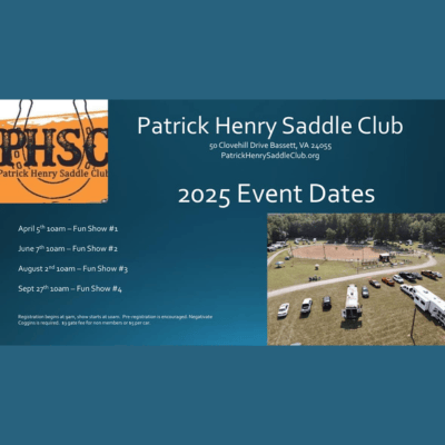 Patrick Henry Saddle Club 50 Clovehill Drive, Bassett, VA, United StatesJudge: Melanie Paxton Food: Highland Farm For more information, please visit the Patrick Henry Saddle Club Facebook page.