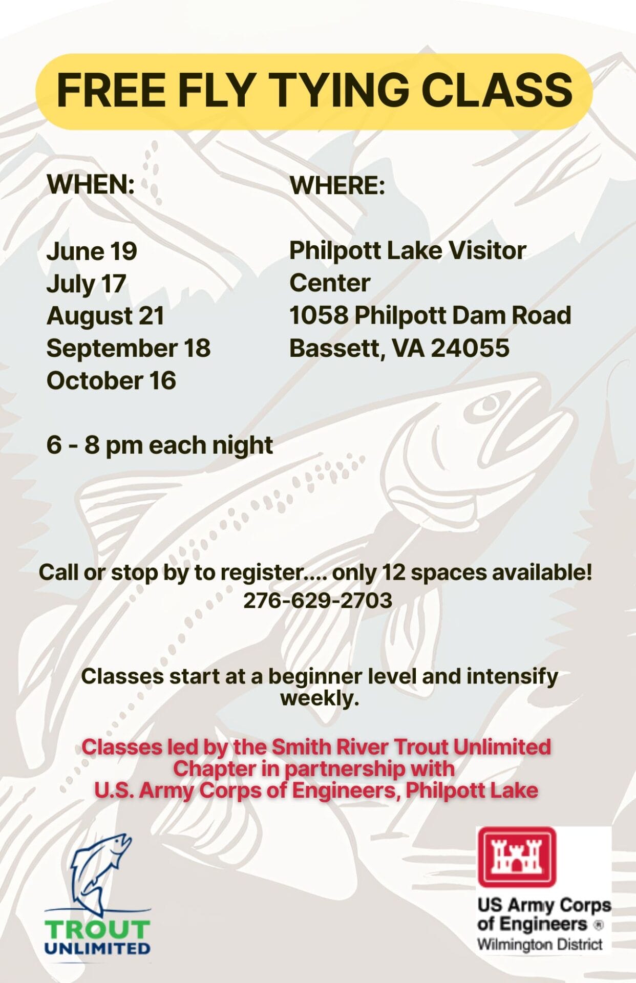 Smith River Trout Unlimited will be offering free fly tying classes at Philpott Lake. Classes will be held at the Philpott Lake Visitor Center located at 1058 Philpott Dam Rd., Bassett, Virginia. Each class will run 6:00-8:00 PM on the following dates: (June 19, July 17, August, 21, September 18, and October 16). Please call 276-629-2703 to register for upcoming classes. Earlier classes will start at a beginner level and will gradually intensify with each session.