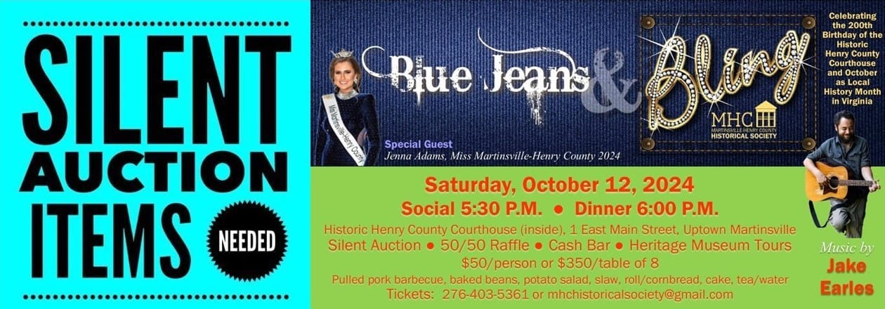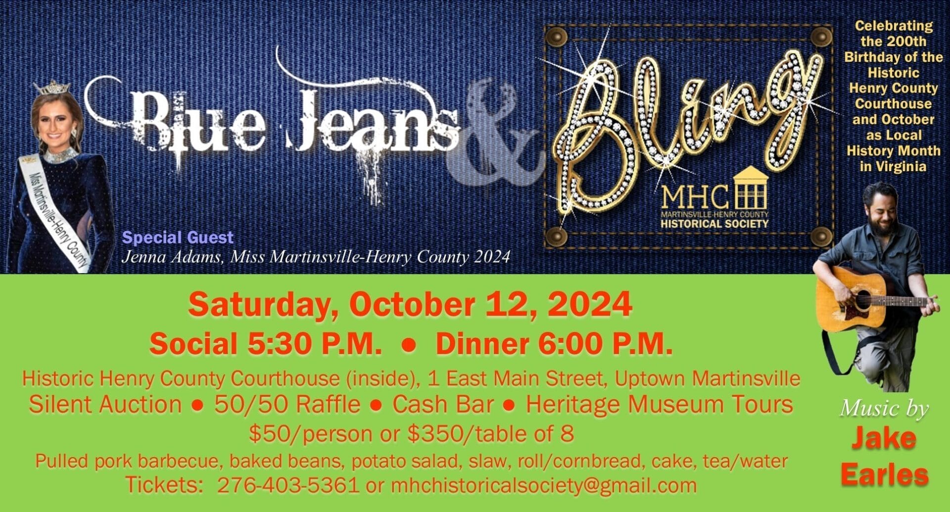 Join the Martinsville-Henry County Historical Society for our annual and largest fundraiser, Blue Jeans & Bling 2024, on Saturday, October 12, 2024, inside of the Historic Henry County Courthouse!